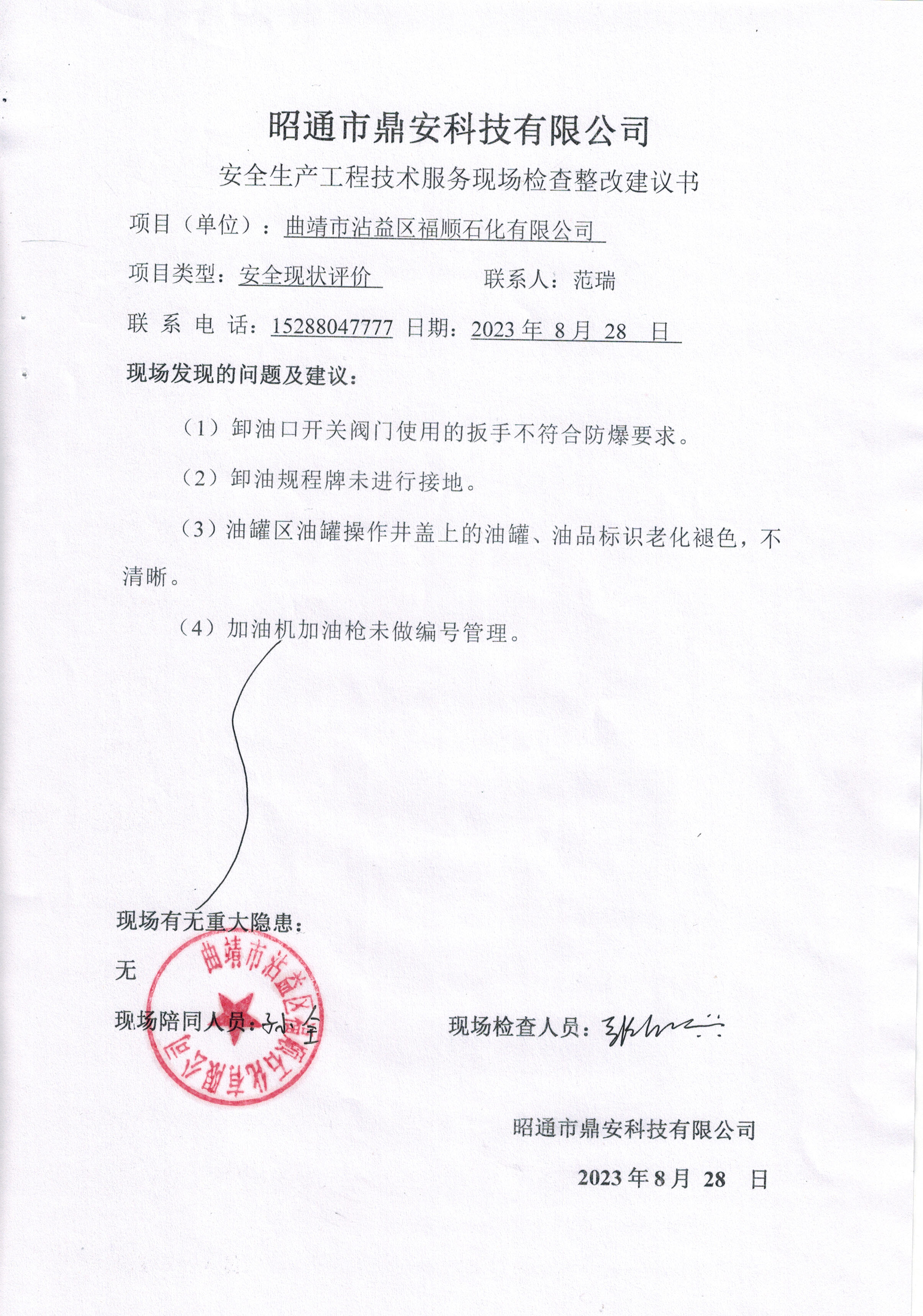 項(xiàng)目名稱 | 曲靖市沾益區(qū)福順石化有限公司安全現(xiàn)狀評(píng)價(jià)報(bào)告 | 合同編號(hào) | DAAPQJ2023-34 | |||||