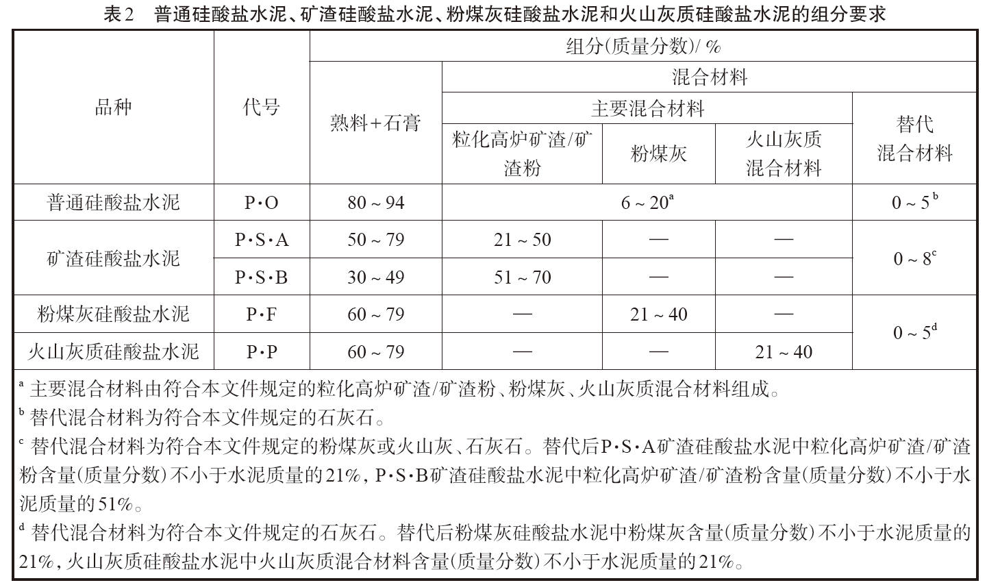 本次標準修訂為:主要混合材料的允許摻量為大于等于6% 且小于等于20%,其中可以使用小于等于5%的替代混合材料替代主要混合材料。這里的主要混合材料是指符合標準規(guī)定的?;郀t礦渣/ 礦渣粉、粉煤灰、火山灰質混合材料,可以是一種材料單獨使用也可以是兩種或三種材料復合使用。替代混合材料則指石灰石。具體見表2 中的備注a和b。