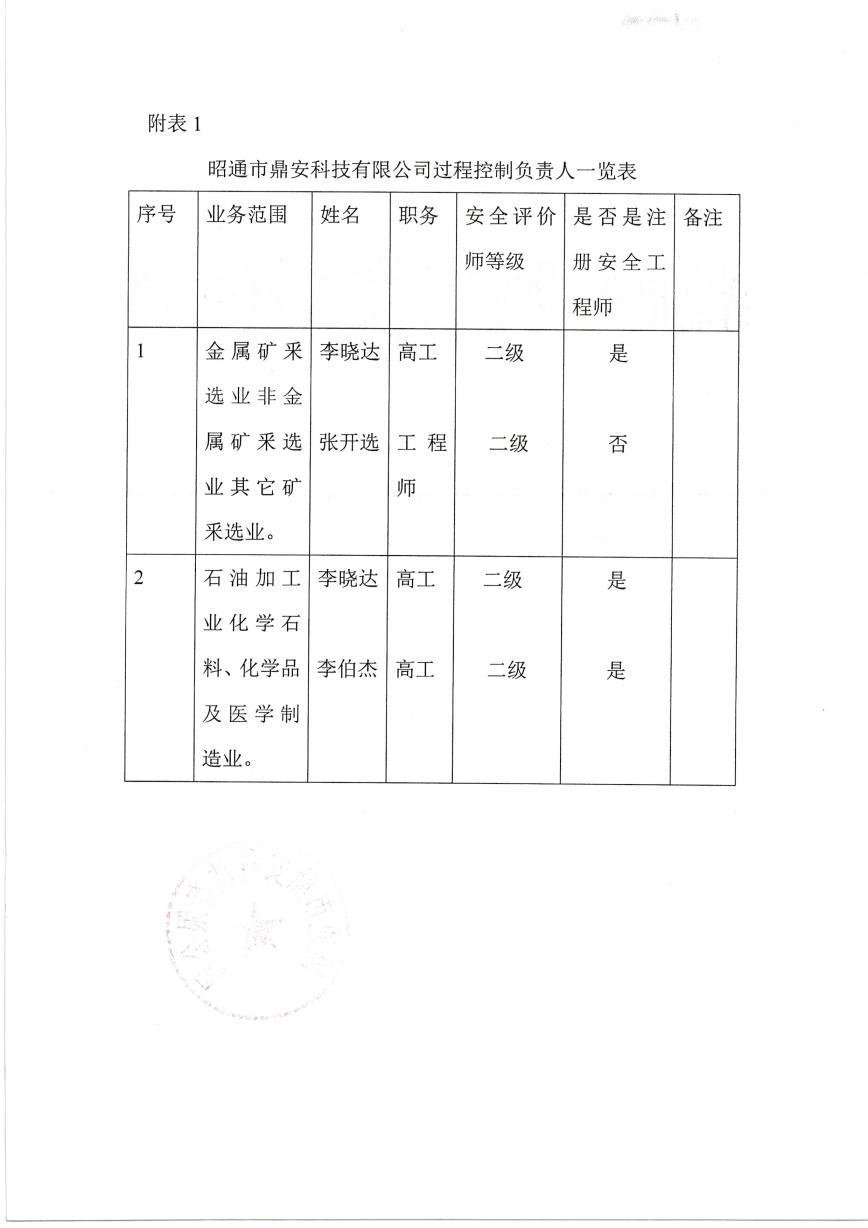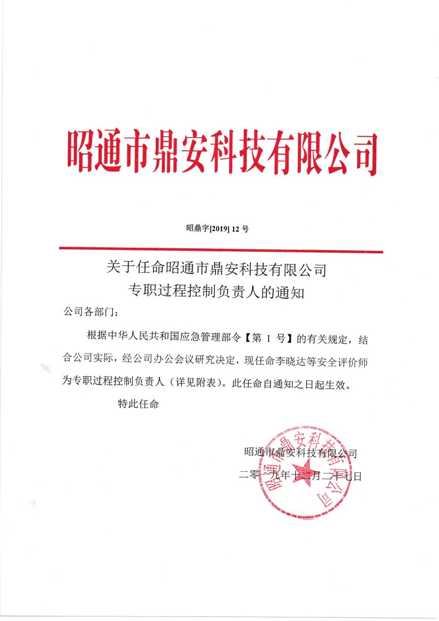 關(guān)于昭通市鼎安科技有限公司專(zhuān)職過(guò)程控制負(fù)責(zé)人的通知