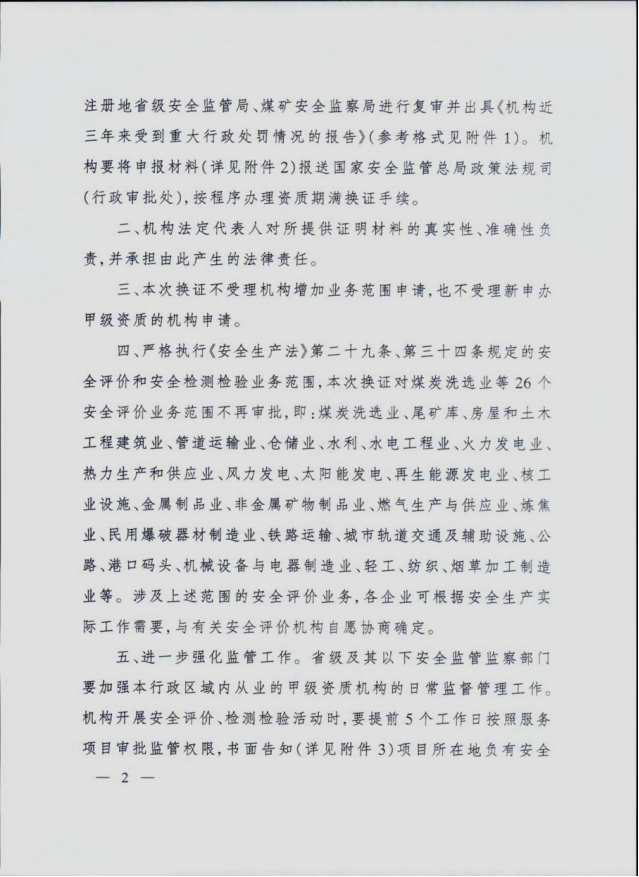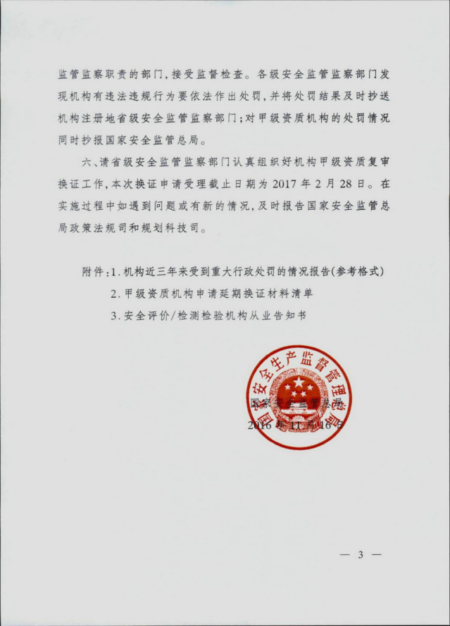 《國家安全監(jiān)管總局關(guān)于安全評(píng)價(jià)與安全生產(chǎn)檢測(cè)檢驗(yàn)機(jī)構(gòu)甲級(jí)資質(zhì)延期換證有關(guān)工作的通知》